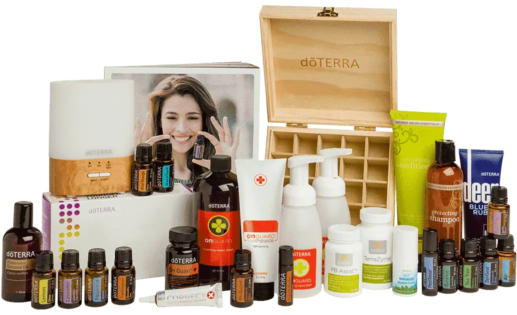 Frankincense (Weihrauch) 15ml, Lavender (Lavendel) 15ml, Lemon (Zitrone) 15ml, Melaleuca (Teebaumöl) 15ml, Peppermint (Pfefferminze) 15ml, Wild Orange 15ml, ZenGest 15ml, doTERRA On Guard 15ml, PastTense 10ml, doTERRA Serenity 15ml, On Guard Beadlets, On Guard Zahncreme, On Guard Hand Wash, On Guard+ Softgels, doTERRA LifeLong Vitality Pack, ZenGest TerraZyme, Deep Blue Rub, Fraktioniertes Kokosöl 115ml, Lumo Diffuser, Schöne Holzbox, doTERRA Air Vapor Stick, Correct-X, PB Assist+, doTERRA Salon Essentials Protecting Shampoo, doTERRA Salon Essential Smoothing Conditioner, Willkommenspaket (Essentials Booklet)
